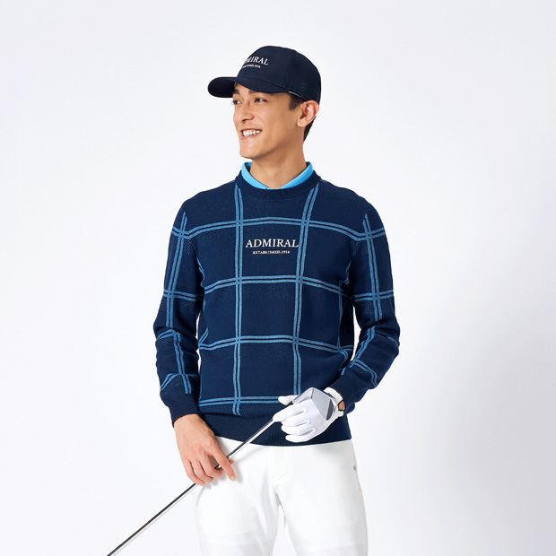 オールシーズン快適な着心地のカラタッチシャツと、ポリエステル×コットン糸を使用したクラシカルなニットのレイヤードコーデ。360度ストレッチの効くパンツがクリーンな印象をプラス。