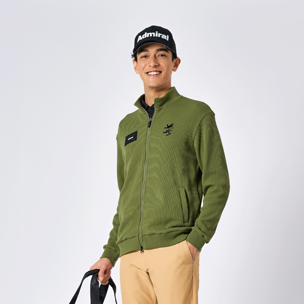 国産ジャカード生地のシャツと、セーター風のカットソー素材を使用したジャケットのレイヤードコーデ。360度ストレッチの効くパンツもアースカラーでまとめて優し気なスタイリングに。