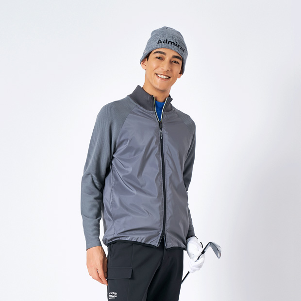 軽量感とイージーケア性が魅力のジャケットと、凹凸感のあるワッフルストレッチ素材を使用したパンツのコーディネート。グレー×黒で表現した大人ならではの柔らかいモノトーンスタイルに。