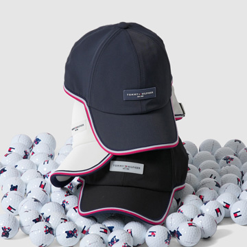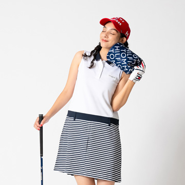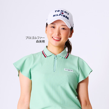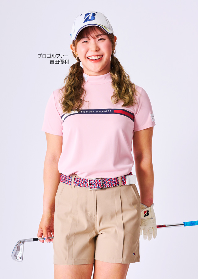 吉田優利プロが着こなす、ピンク×ベージュのグラデ配色が柔らかい印象を与えるコーディネート。トミーヒルフィガーらしい胸のシグネチャーラインがポイントのシャツに、3シーズン役立つベーシックパンツを合わせて。