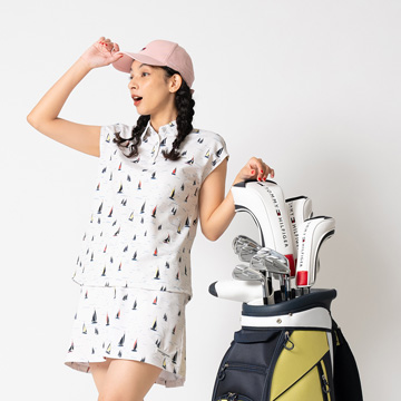 トミーヒルフィガーのノーティカルな世界観をヨットの総柄で表現したセットアップコーデ。リラックスシルエットと背中のタックで肌離れが良いシャツに、ヒップラインを綺麗に見せるスカートを合わせて。