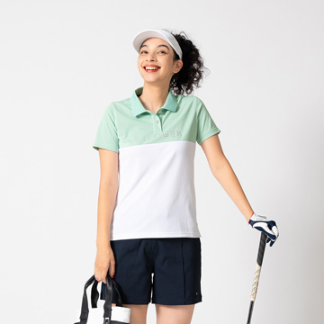 配色切り替えでスポーティさを出しつつ、ラメ入りのクリアボタンが女性らしいポロシャツと、3シーズン着回しのできるショートパンツの王道コーデ。清楚なシャツを黒ボトムスでキリッと引き締めたスタイル。