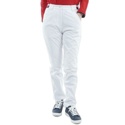 ロゴを全面にエンボス加工で表現したキルトレスジャケットと、裏フリースの3層ボンディングパンツのコーディネート。アウターは優れたストレッチ性で、着たままプレーもオススメ。