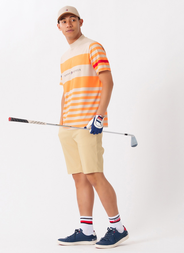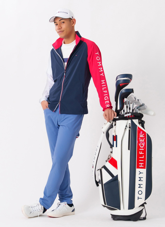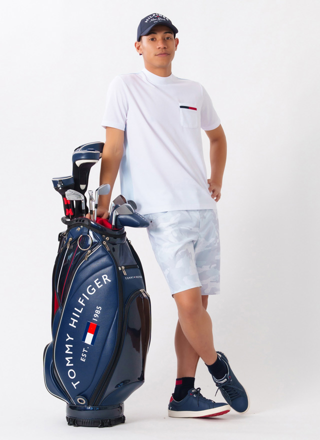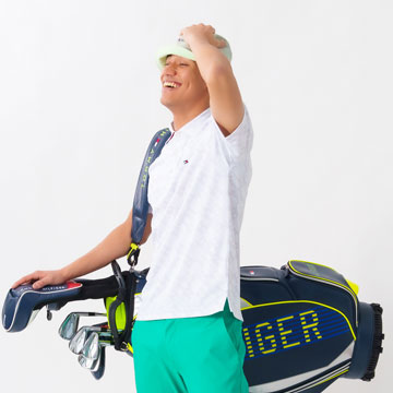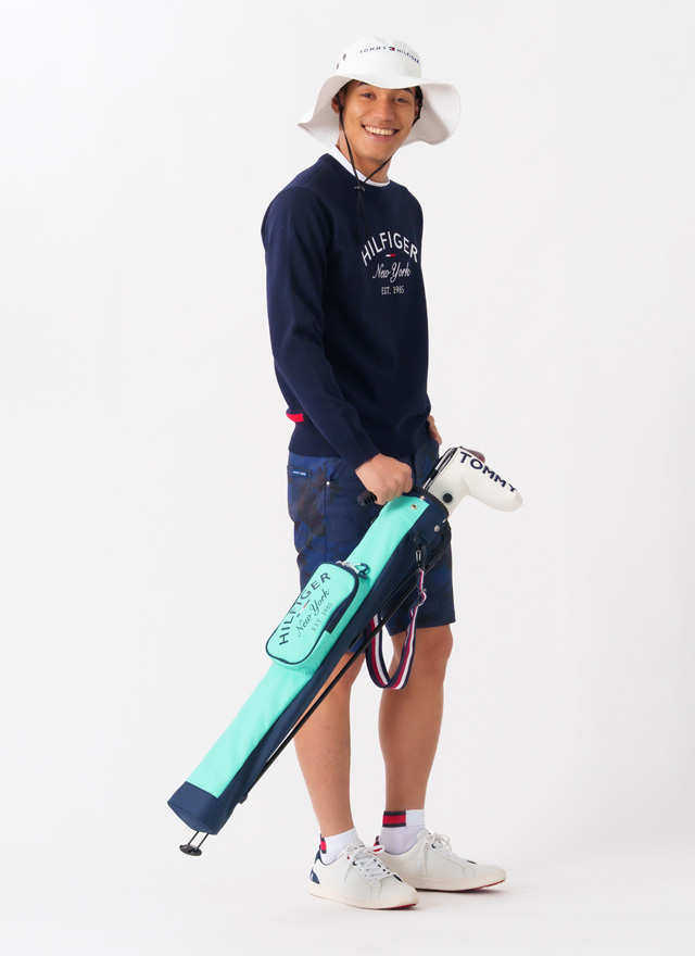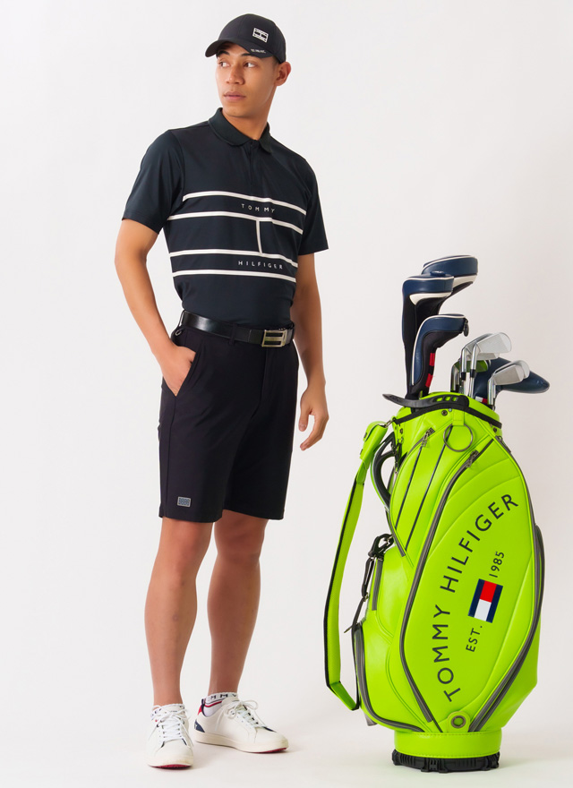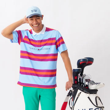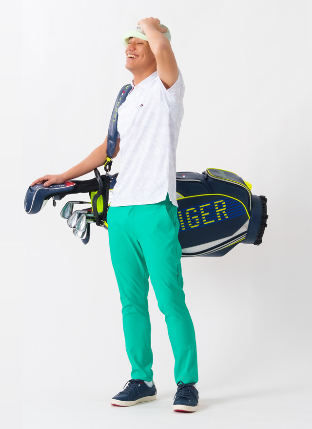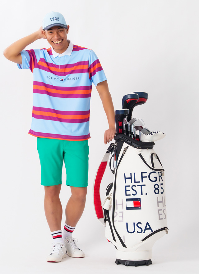 鮮やかなラガーシャツ×グリーンパンツのカジュアル春コーデ。ゆったりシルエットでリラックスした着心地のシャツに、滑りの良い軽量生地を使用した定番パンツを合わせて。個性的なシーズナルキャディバッグも注目。