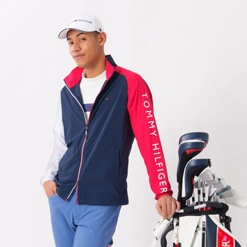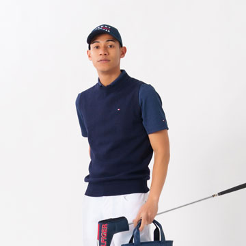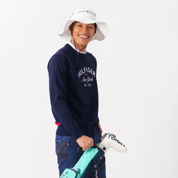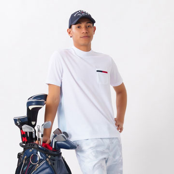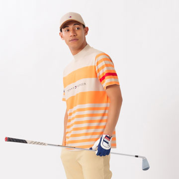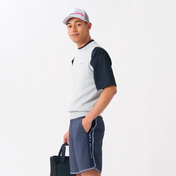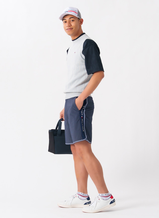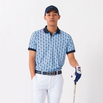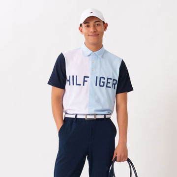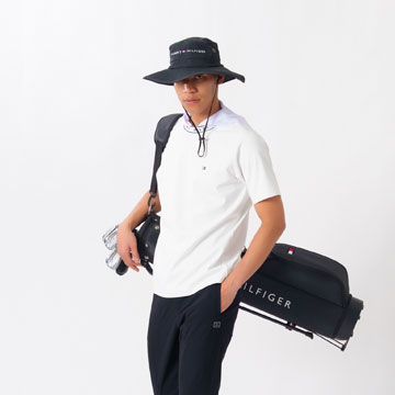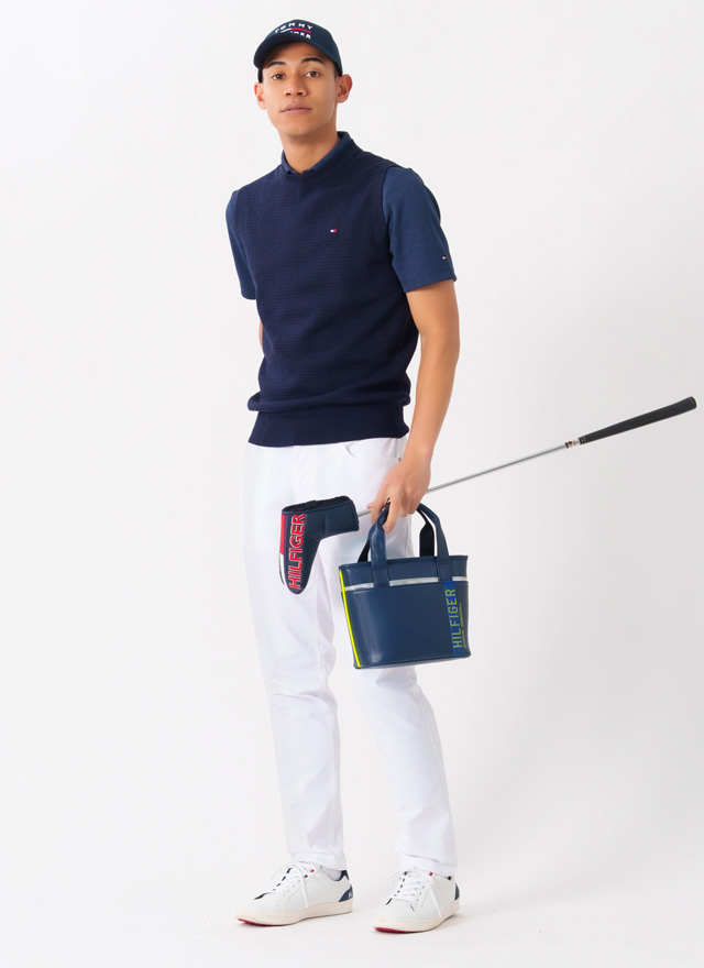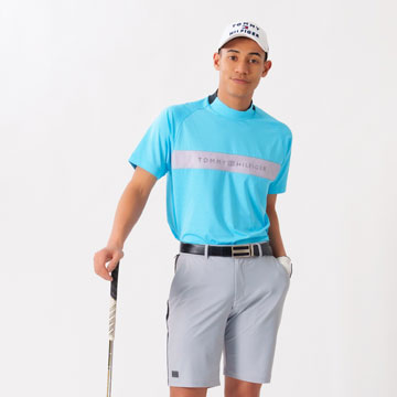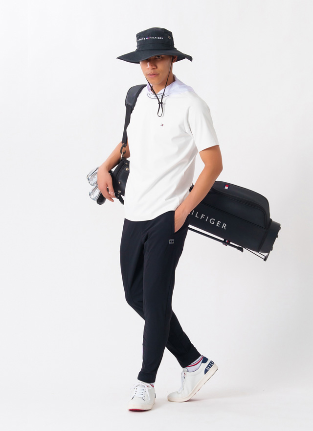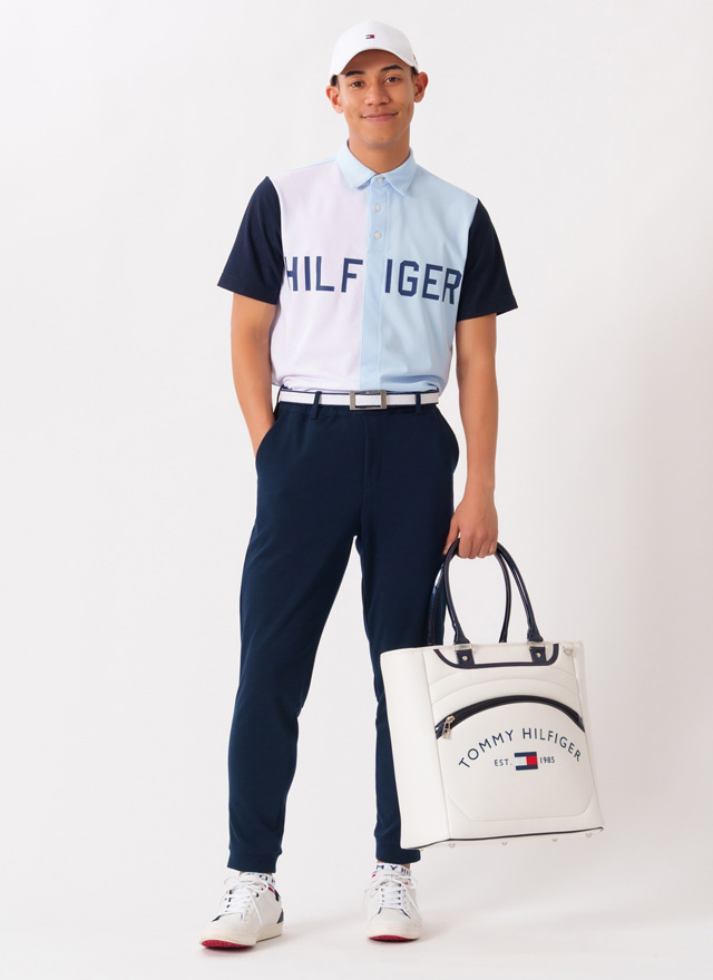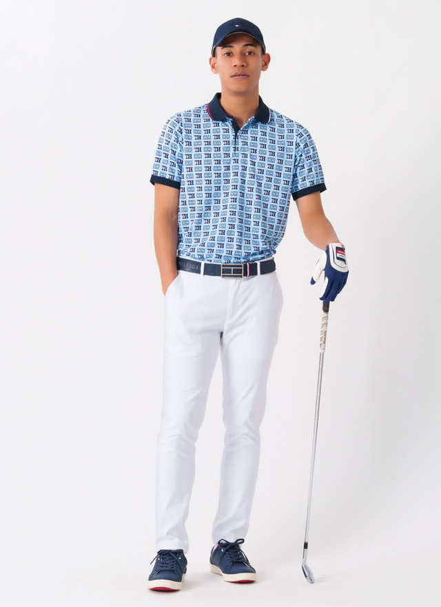 爽やかなカラーで春らしい軽さを魅せるコーディネート。イニシャルTHを上品な光沢感とモノグラム柄で表現したポロシャツに、滑りの良い軽量生地の定番パンツを合わせて。