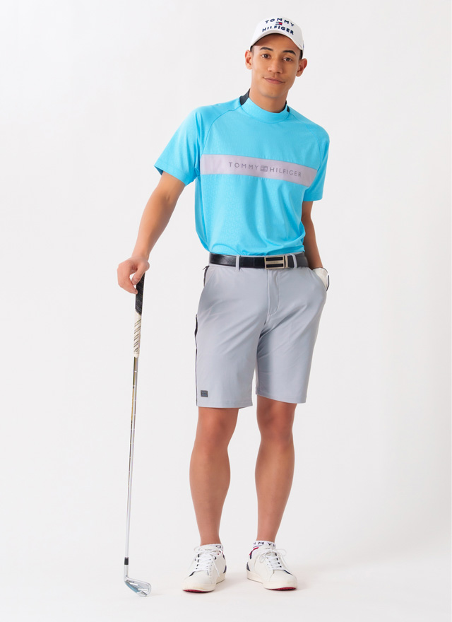 爽やか&軽やかなターコイズブルーをスポーティに着こなすコーディネート。ハイテンションのストレッチ生地にTHをキューブ柄の総柄エンボスで表現したシャツに、軽量でストレッチ性に優れたパンツを合わせて。