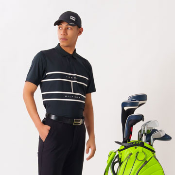 オールブラックでスッキリまとめるパフォーマンスコーデ。ハイテンションのストレッチ生地にパネルボーダーでフラッグを表現したポロシャツと、軽量でストレッチ性に優れたパンツを合わせて。