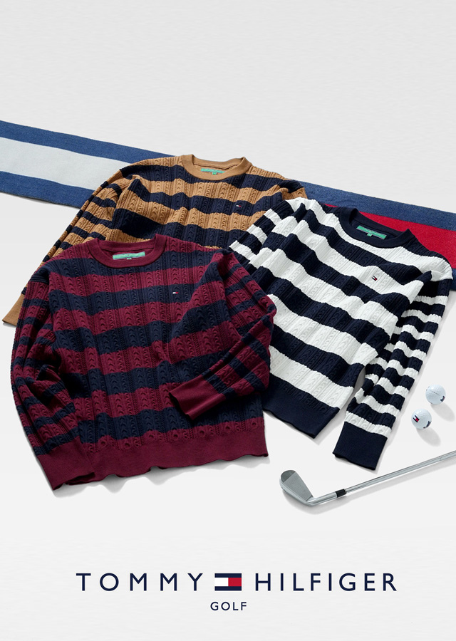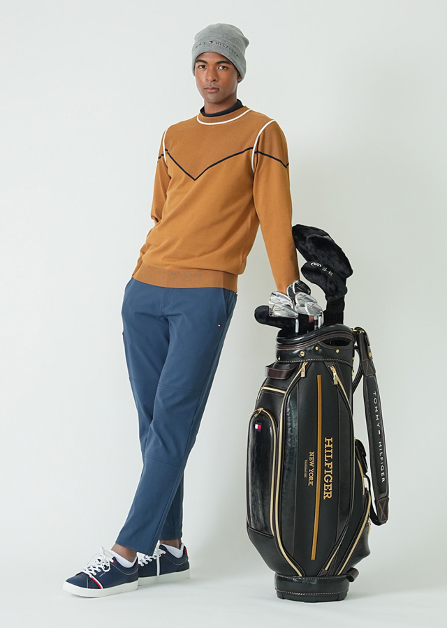秋ゴルフに欠かせない、ニットベストの王道プレッピーコーデ。新色レンガの定番ポロシャツにトミーヒルフィガーらしいケーブルのベストをレイヤード。トップスを選ばないシンプルな定番パンツを合わせて。