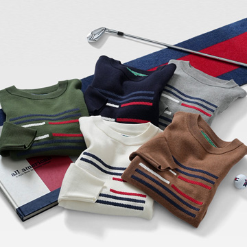2種類の編地で切り替えたクルーネックセーター。チェーン刺繍でライン状にフラッグを表現。カジュアル感のあるロゴ使いでデイリーにもオススメ。起毛感がなくセーターの着初めの時期に最適.
