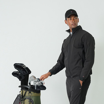 機能性に優れた冬のスポーティコーデ。中綿で暖かく、背中のストレッチ素材でスイングもしやすいアウターに、裏起毛のシャツとスウェットパンツを合わせて。ワントーン×シンプルなデザインがソリッドな着こなしに。