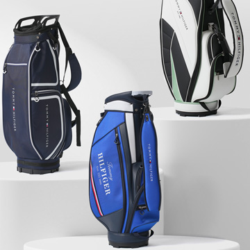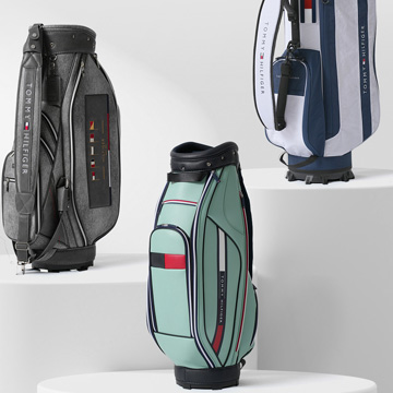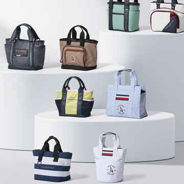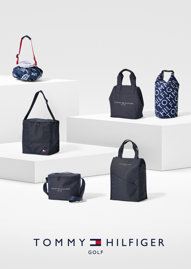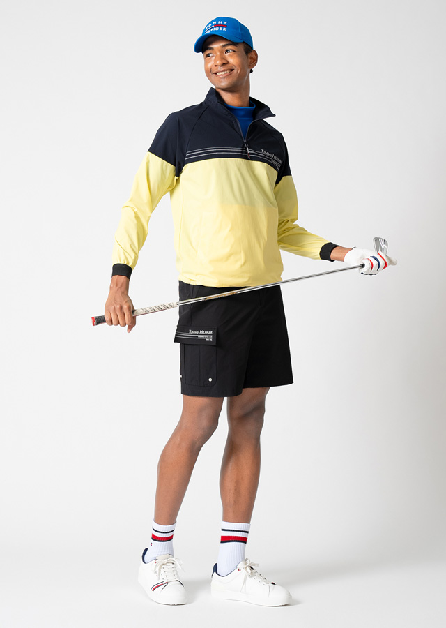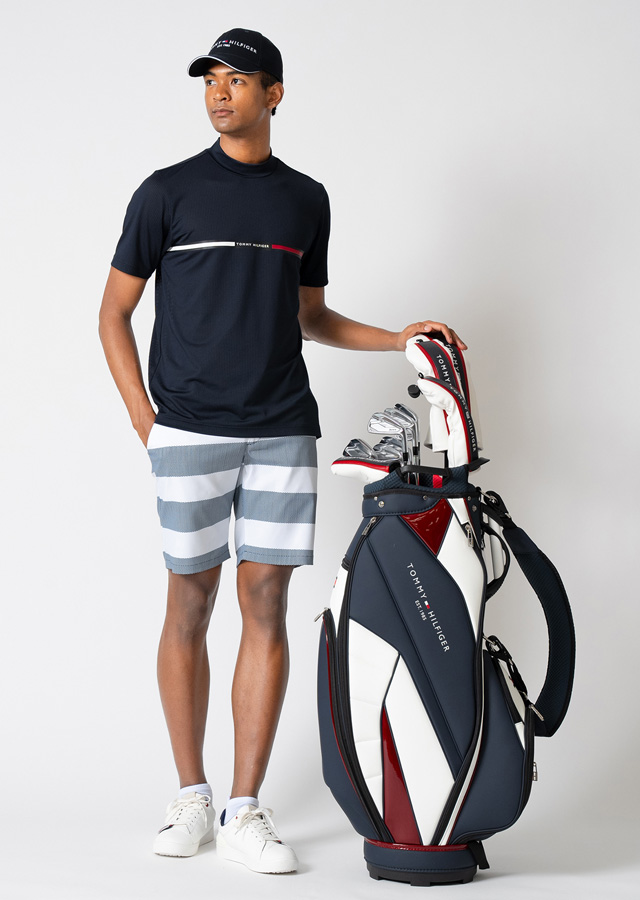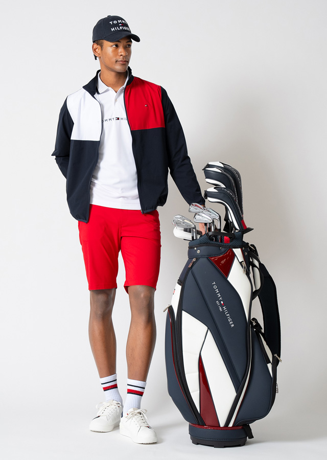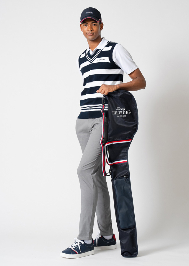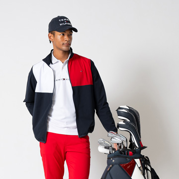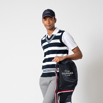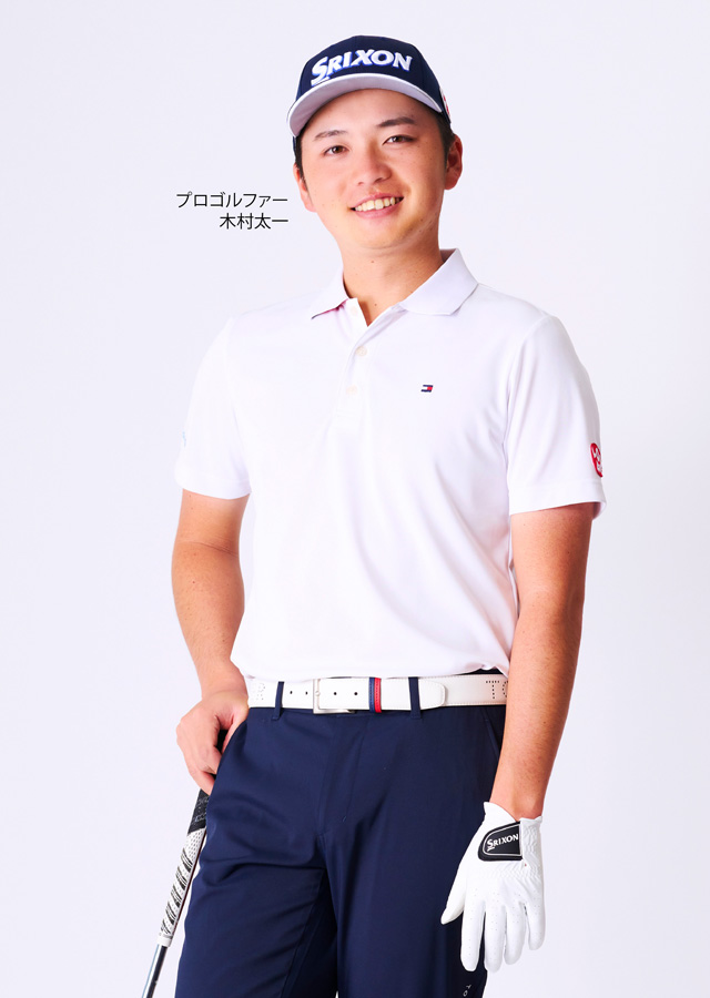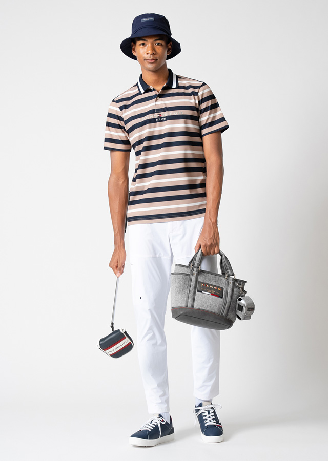 木村太一プロが着こなす、マルチフラッグのポロシャツとベーシックパンツのコーディネート。シャツはトミーヒルフィガーを象徴する、ノーティカルな世界観をフラッグで表現。ベージュ×ホワイトで柔らかな印象に。