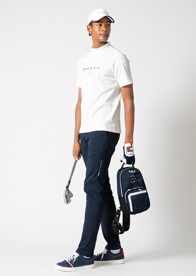 トミーヒルフィガーを象徴するノーティカルな世界観をマルチなフラッグで表現したモックネックシャツと、上品なポリエステルツイルを使用したベーシックパンツのコーディネート。