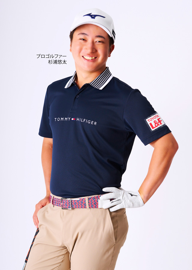杉浦悠太プロが着こなす、トミーヒルフィガーらしい配色の春コーデ。汗をかいてもべた付かない、サラッとした肌触りのボーダーシャツと、上品なポリエステルツイルを使用したベーシックパンツのスタイル。