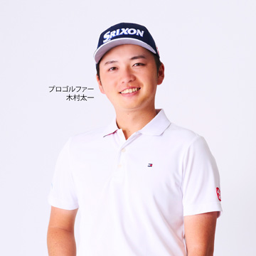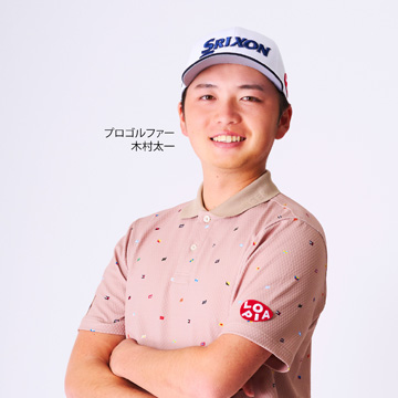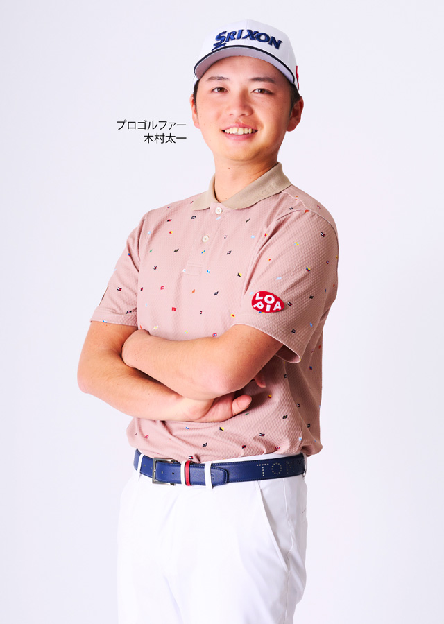 木村太一プロが着こなす、サスティナブルな鹿の子ポロシャツとベーシックパンツのコーディネート。どちらも今季から4Lサイズを追加し、6色とカラー展開も豊富に。
