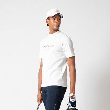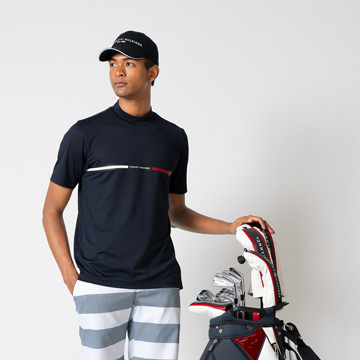 通気性の高いクローズドメッシュ素材を使用したモックネックシャツと、上品なポリエステルツイルを使用したパンツのコーディネート。シャツは胸に、パンツはヒップにシグネチャー配色のラインロゴをデザイン。