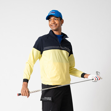 撥水&防水性を備えたタフタ素材を使用したブルゾンとカーゴパンツのコーディネート。インナーシャツはアクセントに鮮やかなブルーを合わせて。軽やかで動きやすく、春のゴルフにオススメのスタイル。