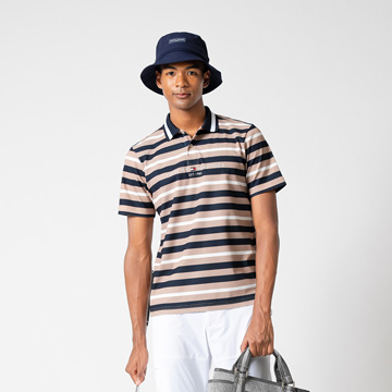 汗をかいてもべた付かない、サラッとした肌触りのポロシャツと、軽量で肌離れの良いパンツのコーディネート。ボーダー×ホワイトで春らしく爽やかな印象に。