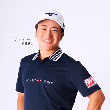 杉浦悠太プロが着こなす、サスティナブルな鹿の子ポロシャツとベーシックパンツのコーディネート。どちらも今季から4Lサイズを追加し、6色とカラー展開も豊富に。