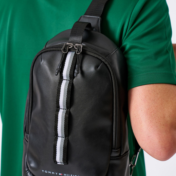 ソフトで高級感のある合皮を使用し、シリーズ共通のシグネチャーテープがポイントのボディバッグ。背面の身体側にはクッションメッシュを使用し、ソフトな肌触りと通気性を確保。