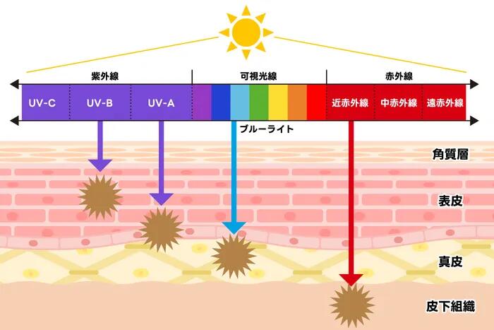 一般的に紫外線というのは太陽光における割合が、 なんと約6%しかありません。 その一方で、近赤外線は約42%を占めます。 この、近赤外線が厄介で、紫外線よりも波長が長く、 肌の深層まで到達し、シワやたるみの原因となってしまいます。 これが「光老化」というもの。 UVカットだけでは、肌は老化していってしまうのです。